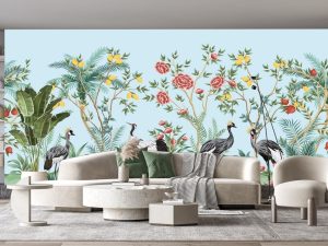 Tropikal Ağaç Çiçek Kuşlar Desen Duvar Kağıdı