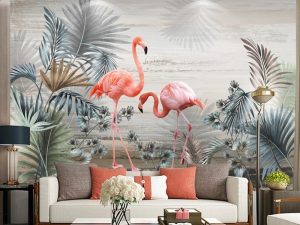 Flamingolar Yapraklar Desen Duvar Kağıdı
