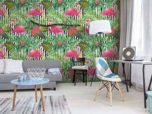 Yapraklar Flamingolar Desen Duvar Kağıdı